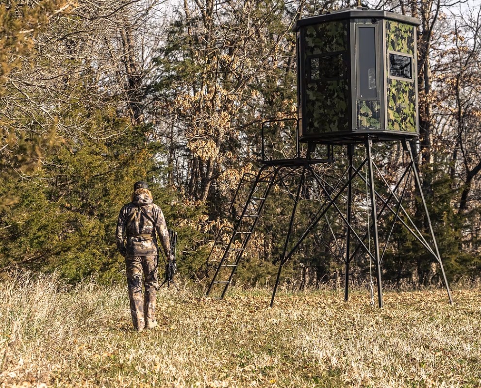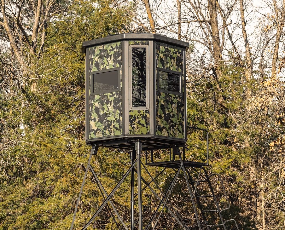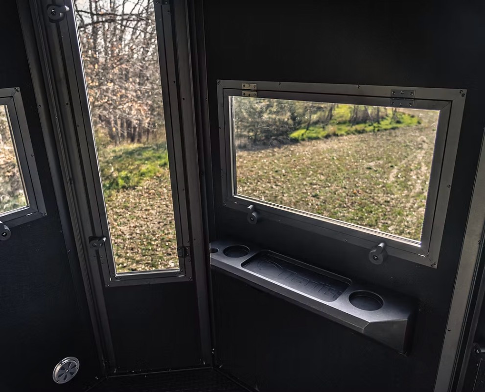 The MONARCH X 2.0 is a premium elevated hard-shell hunting blind system that is extremely spacious & durable. Built as a 10′ elevated advanced steel tower design, you have the ability to adjust the tower height to 5′ at your discretion during your installation. With padded foam flooring over a solid steel floor, (8) durable aluminum walls with fully insulated interior cavities (sandwich panels), silent latches & hinges on all windows and the door, improved vent design, 8 x total shooting glass windows (premium: 5 x archery/vertical; 3 x gun/crossbow/horizontal) and a very comfortable 72″ x 72″ x 85″ interior (1000lb weight limit), you're bound to enjoy hunting hard out of this premium elevated blind system by RADIX Hunting! Total blind weight with 10' tower system: 800lbs