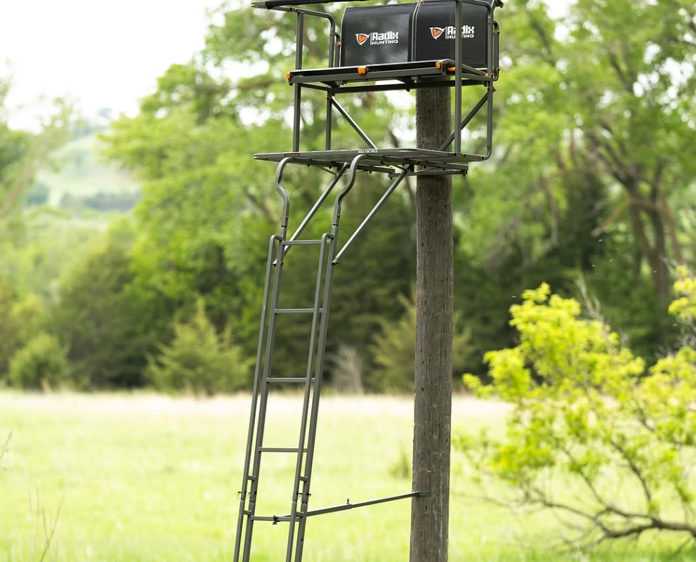 Introducing the new Trezz L2 Double-Man Ladderstand by Radix Hunting. With a 17.5' height to the shooting rest, a very durable and sturdy foot platform, and an ergonomic seat and backrest, this ladderstand is bound to leave you comfortable hunting from above. The powder-coated steel design with the double rail is meant to last in the elements season to season. Having a 500lb. weight-capacity rating allows for a hunter and more than all of his gear to ascend with certainty. Take to the deer woods with the Radix Hunting Trezz L2 Double-Man Ladderstand this season and rule the wild!